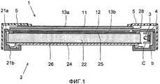 На ступенчатой части 28, сформированной вокруг края открытой части верхней рамы 21a устройства 2 подсветки, размещена периферийная часть жидкокристаллической панели 1. Оправа 5 покрывает эту периферийную часть жидкокристаллической панели 1; оправа 5 и верхняя и нижняя рамы 21a и 21b скреплены вместе так, что жидкокристаллическая панель 1 и устройство 2 подсветки соединены так, чтобы составлять устройство жидкокристаллического дисплея.On the stepped