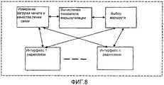 Фиг.8 - это блок-схема, иллюстрирующая подробности узла с использованием показателя маршрутизации настоящего изобретения. Узел содержит, помимо прочего, модуль 815 выбора маршрута, модуль 805 измерения загрузки/степени использования канала и качества линии связи, модуль 810 вычисления показателей маршрутизации и одни или более модулей 820a,..., 820n интерфейса радиосвязи. Модуль 805 измерения загрузки/степени использования канала и качества линии связи периодически измеряет качество и загрузку/степень использования линии связи/канала к каждому из своих соседей через модули 820a,..., 820n интерфейса радиосвязи. Он предоставляет результаты измерений в модуль вычисления показателей маршрутизации, который периодически вычисляет показатели маршрутизации. Показатели маршрутизации включают в себя функцию затрат в линии связи, квантованную функцию затрат в линии связи и квантованную функцию затрат маршрута. Отметим, что узел может иметь несколько соседей, несколько радиоинтерфейсов и несколько физических/логических каналов и линий связи. Качество и нагрузка всех этих линий связи должна периодически измеряться посредством модуля измерений. Модуль выбора маршрута выполняет протоколы/алгоритмы маршрутизации и определяет маршрут и радиоинтерфейс, чтобы перенаправлять данные. Он также обменивается сообщениями управления маршрутизацией с другими узлами в сети через модули 820a,..., 820n интерфейса радиосвязи. Отметим, что узел может иметь один или более интерфейсов радиосвязи и других интерфейсов связи.8 is a block diagram illustrating the details of a node using the routing metric of the present invention. The assembly includes, among other things, a route selection module 815, a channel load / utilization and link quality measurement module 805, a routing metric calculation module 810, and one or more radio interface modules 820a, ..., 820n. Module 805 measure the load / utilization of the channel and the quality of the communication line periodically measures the quality and load / utilization of the communication line / channel to each of its neighbors through the modules 820a, ..., 820n of the radio interface. It provides measurement results to a routing metric calculation module that periodically calculates routing metrics. Routing metrics include a link cost function, a quantized link cost function, and a quantized route cost function. Note that a node can have several neighbors, several radio interfaces, and several physical / logical channels and communication lines. The quality and load of all these communication lines should be periodically measured using the measurement module. The route selection module executes routing protocols / algorithms and determines the route and the air interface to redirect data. It also exchanges routing control messages with other nodes in the network via radio interface modules 820a, ..., 820n. Note that a node may have one or more radio interfaces and other communication interfaces.