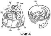 Плунжер 330, в общем, содержит наконечник 332, втулку 331 и, напротив наконечника 332, расширенный захватный участок 331', который позволяет пользователю вытягивать рукой плунжер 330 в отведенное положение. Наконечник 332 обычно содержит маркировку М, обозначающую место, где трубка 113 выходит из инфузионного набора 314, расположенного под наконечником, благодаря чему пользователь может контролировать ориентацию трубки после установки инфузионного набора. Кроме того, наконечник 332 содержит выемку 332' для вмещения инфузионного набора 326 с канюлей 326, через которую продолжается вводная игла 312, при этом инфузионный набор 314 предпочтительно удерживается в заданном положении сцеплением силами трения вводной иглы 312 с внутренней поверхностью инфузионного набора 314. Плунжер 330 содержит две противоположные жесткие стенки 306, продолжающиеся радиально наружу из втулки 331. Стенки 306 продолжаются в аксиальном направлении устройства 310, т.е. в том же общем направлении, что и вводная игла 312, и соединены с вышеупомянутой пружиной. Кроме того, как лучше всего видно на фиг. 3, стенки 306 содержат, каждая, боковой выступ 307 с пальцем 358, который фиксируется с возможностью деблокирования в зацеплении с соответствующей одной из полок 366 корпуса 328 путем защелкивания в отведенном положении плунжера 330. Углубления 303, предпочтительно смещенные относительно полок 366 на приблизительно 90°, будут вынуждать противоположные полки 366 раздвигаться, когда рукой прилагается вышеупомянутое усилие, и корпус 328 принимает овальную форму, что выводит палец 358 на каждой стенке 306 из зацепления с соответствующей полкой 366. Для удерживания проксимальной части трубки 113 (не показанной), которая намотана на плунжер 330, стенка 306 содержит прорезь, выполненную в размер для вмещения небольшого отрезка трубки 113 и для предотвращения случайного отрыва инфузионного набора 314 с плунжера 330 пользователем, когда трубку разматывают для соединения с источником лечебной жидкости.The
