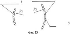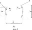 где l1 и l2, соответственно, представляют расстояния от пятна до поверхности первого источника ультразвука (пьезоэлектрического кристалла) 1 и до поверхности второго источника ультразвука (пьезоэлектрического кристалла) 2, т.е. расстояния от фокальной точки до поверхностей двух пьезоэлектрических кристаллов. По радиусам поверхности полости ультразвуковых датчиков и по расстоянию между двумя датчиками (длины полости), резонансный датчик может быть разделен на симметричный, конфокальный, концентрический, и концентрический и симметричный и т.д. Взаимосвязь между радиусом этих резонансных полостей и длиной полости выражается следующим образом:where l1 and l2 , respectively, represent the distances from the spot to the surface of the first ultrasound source (piezoelectric crystal) 1 and to the surface of the second ultrasound source (piezoelectric crystal) 2, i.e. the distance from the focal point to the surfaces of two piezoelectric crystals. According to the radii of the surface of the cavity of ultrasonic sensors and the distance between the two sensors (cavity length), the resonant sensor can be divided into symmetric, confocal, concentric, and concentric and symmetric, etc. The relationship between the radius of these resonant cavities and the length of the cavity is expressed as follows: