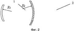 Как показано на фигуре 9, указанный источник ультразвука и указанный отражающий элемент размещены конфокально. Их радиусы составляют, соответственно, R1 и R2. В этом случае при установлении длины резонансной полости L параметры резонансной полости имеют следующую зависимость: 2L=R1+R2. Радиус пятна этой резонансной полости представляет собой:As shown in FIG. 9, said ultrasound source and said reflective element are confocal. Their radii are, respectively, R1 and R2 . In this case, when establishing the resonance cavity length L, the resonance cavity parameters have the following dependence: 2L = R1 + R2 . The spot radius of this resonance cavity is: