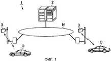 Ниже, со ссылкой на фиг. 1-8, будет описан вариант выполнения, реализующий настоящее изобретение. На фиг. 1 показана схема системы 1 датчиков, используемая как система обработки информации дорожного движения, в соответствии с настоящим вариантом выполнения. Система 1 датчиков включает в себя сервер 2 датчиков, ретранслятор 3 и навигационное устройство 10 (см. фиг. 2), которые составляют систему обработки информации дорожного движения, установленную в транспортном средстве C. Сервер 2 датчиков и ретранслятор 3 соединены таким образом, что они могут передавать и принимать различные данные через сеть N, сформированную из сети на основе частной линии или сети общего пользования. Ретранслятор 3 установлен вдоль дороги и принимает данные датчиков из навигационного устройства 10, установленного в транспортном средстве C, используя беспроводную связь.Below, with reference to FIG. 1-8, an embodiment implementing the present invention will be described. In FIG. 1 is a diagram of a