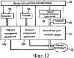 Обратимся к фиг.12, на которой показана система в соответствии с иллюстративным вариантом выполнения и функциональные связи ее элементов. Данная система содержит два определяющих давление на ране датчика 40а и 40b в аппаратуре системы, которые проходят отдельно (через дискретные просветы или трубопроводы) от аппаратуры к адаптеру пониженного давления, при этом они не объединены до соединения дискретных просветов у связующего звена адаптера и распределительной магистрали. Как указано выше, адаптер пониженного давления содержит два отдельных определяющих давление канала, а также проход для жидкости через контейнер 18 к вакуум-насосу 38 в аппаратуре системы. Внутри аппаратуры системы каждый из вспомогательных трубопроводов с измерительными просветами снабжен электромагнитными клапанами 92 и 94, которые сбрасывают давление на ране в конце проведения терапии, во время периодической терапии, или если требуется удалить закупорки. Управление этими клапанами, так же как и клапаном, соединенным с источником 38 пониженного давления, выполняет микропроцессор/контроллер 90. Аналогично, микропроцессор/контроллер 90 управляет работой вакуум-насоса 38 и получает данные от первого и второго измеряющих давление устройств 40а и 40b. Микропроцессор/контроллер 90 запрограммирован для проведения текущего контроля давления на ране, выполняемого посредством двух считываний показаний, связанных с двумя вспомогательными каналами с просветами. В случаях, когда жидкость поступает в один из просветов, данная жидкость будет вызывать задержку во времени срабатывания в ответ на изменение давления этого просвета по сравнению со свободным просветом. По мере увеличения закупорки будет увеличиваться задержка. При выявлении задержки данная система будет регулировать давление на ране в соответствии с давлением в открытом просвете и будет пытаться удалить жидкость из закупоренного просвета путем стравливания давления соответствующим клапаном. Предпочтительно, программное средство будет пытаться удалить закупорку этим способом несколько раз. Если данная система не достигнет успеха в удалении закупорки, то, начиная с этого момента, программное средство будет игнорировать неисправный просвет, а управление системой будет выполняться в соответствии с оставшимся свободным просветом. Вышеописанная конструкция адаптера пониженного давления выполнена так, чтобы довести до максимума возможность иметь по меньшей мере один свободный вспомогательный измерительный просвет в любое заданное время.Turning to FIG. 12, a system is shown in accordance with an illustrative embodiment and the functional relationships of its elements. This system contains two