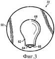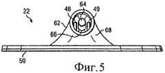 Фиг.5 показывает более четко вид с торца той же конструкции, которая показана на фиг.4, вместе с конструкцией коленчатой области 68 и внутренней конструкцией корпуса 62 трубопровода. На этом виде показаны те же элементы, соединенные с приклеивающимся к раневой повязке адаптером 22 для пониженного давления. Основание 50 и отверстие 54 расположены так, как показано на фиг.4. Корпус 62 трубопровода показан с расположением, обеспечивающим вмещение секции трубопровода для присоединения к остальной части системы согласно данному изобретению.FIG. 5 shows a clearer end view of the same structure as shown in FIG. 4, together with the construction of the cranked