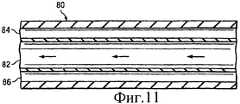 Обратимся теперь к фиг.10 и 11 для более подробного описания конструкции усовершенствованной трубки 80 подачи пониженного давления, которая выполнена с возможностью работы совместно с данной системой согласно иллюстративному варианту выполнения данного изобретения. Трубка 80 подачи пониженного давления предпочтительно содержит основной центральный просвет 82 и вспомогательные просветы 84 и 86. Вспомогательные просветы 84 и 86 в целом используются для проведения измерений давления. На фиг.11 показано, что поток жидкости, обозначенный стрелками, проводится через основной просвет 82, тогда как вспомогательные просветы 84 и 86 остаются свободными от жидкости или любого негазообразного вещества. Ракурсы поперечных сечений, изображенные на фиг.10 и 11, показывают соотносительные диаметры сечений основного канала 82 и вспомогательных каналов 84 и 86. Устройство 80 подачи имеет овальное сечение, которое создает оптимальную гибкость, не допускающую разрушения любого из описанных просветов. Такая форма поперечного сечения также ориентирует вспомогательные просветы 84 и 86 так, что просветы совмещаются соответственно со связующими звеньями на вышеописанном усовершенствованном адаптере пониженного давления.Turning now to FIGS. 10 and 11 for a more detailed description of the construction of an improved reduced