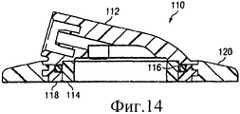 На фиг.14 показаны те же вышеупомянутые элементы в сборке, и соответственно более отчетливо подробно показан способ взаимного соединения данных элементов, а также способ их совместного или относительного поворота. На этом виде также показано накидное уплотнительное кольцо 116 для обеспечения соответствующего уплотнения внутренней камеры пониженного давления, образованной адаптером 110 пониженного давления. На этом виде также отчетливо проиллюстрирован способ возможного соответствующего расположения внутренних деталей и элементов в проходе канала на нижней стороне верхнего элемента 112 из ПВХ для выполнения функции продвижения жидкости к основному трубопроводу, как описано выше.Fig. 14 shows the same aforementioned elements in an assembly, and accordingly a more clearly shown method for interconnecting these elements, as well as a method for their joint or relative rotation. This view also shows an o-