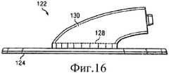 В некоторых вариантах выполнения используется полоска, чувствительная к летучим органическим соединениям (ЛОС), которая установлена на адаптере пониженного давления или на соединенной с ним салфетке. Под воздействием намеченных ЛОС, о которых известно, что они формируются в присутствии определенных микроорганизмов, цветовая структура становится видимой, при этом идентифицируется тип микроорганизма, присутствующего в текучей среде раны. В соответствии с фиг.15 и 16 адаптер 122 содержит основание 124 и корпус 130 трубопровода, аналогичный вышеописанному при рассмотрении фиг.2-9. Показано расположение чувствительной к ЛОС панели 128 в углубленной области 126 корпуса 130 трубопровода. На фиг.16 можно видеть, что при заданном полупрозрачном или прозрачном характере материала, из которого выполнен адаптер 122, ЛОС панель 128 можно контролировать визуально даже снаружи, в то время как адаптер 122, основание 124 которого расположено напротив распределительной магистрали раневой повязки, находится на месте. Таким образом, как показано, предпочтительным расположением этой чувствительной к ЛОС панели 128 является расположение внутри углубленной области 126 по ее периферии. Фиг.15 более отчетливо показывает расположение этой панели внутри углубленной области 126, где она постоянно подвергается воздействию веществ текучих сред, вытягиваемых из раны. Возможны другие схемы расположения панелей, при условии, что они подвергаются достаточному воздействию текучих сред раны.In some embodiments, a strip sensitive to volatile organic compounds (VOCs) is used, which is mounted on a low pressure adapter or on a napkin connected to it. Under the influence of the intended VOCs, which are known to be formed in the presence of certain microorganisms, the color structure becomes visible, and the type of microorganism present in the wound fluid is identified. In accordance with FIGS. 15 and 16,
