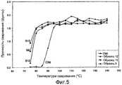 На ФИГ.5 представлены результаты относительно прочности термосваривания для различных вариантов описываемого здесь сополимера, получаемого с использованием металлоцена согласно данному изобретению, по сравнению с сополимерами, получаемыми с использованием металлоцена, имеющими такую же плотность и индекс расплава.Figure 5 presents the results regarding the heat sealing strength for various variants of the copolymer described here, obtained using the metallocene according to this invention, compared with copolymers obtained using the metallocene having the same density and melt index.