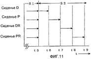 Фиг.11 представляет собой чертеж, показывающий управляющий режим системы обогрева транспортного средства этого варианта осуществления. Этот вариант осуществления применяется к управляющему режиму S2 обогревателя сиденья восьмого варианта осуществления. В этом варианте осуществления обогреватели сиденья установлены отдельно на сиденьи для водителя (сиденьи D), переднем пассажирском сиденьи (сиденьи P), заднем сиденьи со стороны сиденья для водителя (сиденьи DR) и заднем сиденьи со стороны переднего пассажирского сиденья (сиденьи PR). Следует отметить, что хотя подача энергии обогревателя сиденья в каждом сиденьи реализуется посредством переключателя подачи энергии, предусмотренного в нем, может быть использована конфигурация, в которой датчик определения пассажира установлен в каждом сиденьи, так что сиденье или сиденья питаются только тогда, когда определено наличие пассажиров. В последующем описании следует понимать, что все четыре сиденья заняты пассажирами.11 is a drawing showing a control mode of a vehicle heating system of this embodiment. This embodiment is applied to the control mode S2 of the seat heater of the eighth embodiment. In this embodiment, the seat heaters are mounted separately on the driver's seat (seat D), the front passenger seat (seat P), the rear seat on the driver's side (seat DR), and the rear seat on the front passenger seat (seat PR). It should be noted that although the power supply of the seat heater in each seat is provided by the power supply switch provided therein, a configuration can be used in which a passenger detection sensor is installed in each seat, so that the seat or seats are powered only when the presence of passengers is detected. . In the following description, it should be understood that all four seats are occupied by passengers.