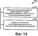 Фиг.14 показывает исполнение устройства 1400 для обработки данных трафика и информации управления. Устройство 1400 включает в себя модуль 1412 для мультиплексирования данных трафика и первой информации управления, чтобы получить мультиплексированные данные, и модуль 1414 для исключения мультиплексированных данных с помощью второй информации управления.14 shows a design of an
