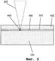 Как видно из схемы на Фиг.5, лазерный луч 203 проходит сквозь нелегированный верхний слой 402 эпитаксиальной пленки и фокусируется в пятно диаметром 1 мм, что обеспечивает плотность энергии 10 Дж/см2. Под действием сфокусированного в пятно диаметром 1 мм инфракрасного лазерного луча 203, импульсного CO2 лазера с длиной волны λ=10,6 мкм, слабо поглощающегося в нелегированном верхнем слое 402 гомоэпитаксиальной пленки нитрида галлия и сильно поглощающегося в легированном мелкими донорными примесями нижнем слое 406 гомоэпитаксиальной пленки нитрида галлия, происходит локальный нагрев нижнего слоя 406 гомоэпитаксиальной пленки в области 404, определяемой пересечением инфракрасного лазерного луча 203 с границей раздела 505 между нелегированным верхним слоем 402 и легированным нижнем слоем 406 гомоэпитаксиальной пленки нитрида галлия. Локальный нагрев до температуры выше 900°C приводит к химическому разложению кристалла нитрида галлия на газообразный азот и жидкий галлий в области 404. Перемещение фокуса лазерного луча 203 со скоростью 10 см/с в горизонтальной плоскости, параллельной границе раздела 405, приводит к последовательному разложению нитрида галлия в наборе областей 404 и ослаблению границы раздела 506 между нелегированным верхним слоем 402 и легированным нижним слоем 406 гомоэпитаксиальной пленки. Наклеивая затем нелегированный верхний слой 402 гомоэпитаксиальной пленки на временную металлическую, керамическую или пластиковую подложку и прилагая небольшое механическое или термомеханическое напряжение, можно отделить нелегированный верхний слой 402 гомоэпитаксиальной пленки от неиспарившейся части нижнего слоя 406 и подложки 101.As can be seen from the diagram in Figure 5, the