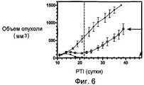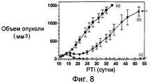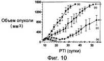 На ФИГ.6 представлена активность соединения примера 11 при 1 мкмоль/кг TIW в течение 2 недель (6 доз) на FR-положительные опухоли KB с 40 мкмоль/кг ЕС20 (комплекс рения) (□) и без него (■) относительно контролей без введения (●); соединение примера II отдельно показало 5/5 полных ответов; соединение примера 11+ЕС20 показали 0/5 полных ответов.FIG. 6 shows the activity of the compound of Example 11 at 1 μmol / kg TIW for 2 weeks (6 doses) on FR-positive KB tumors with 40 μmol / kg EC20 (rhenium complex) (□) and without it (■) relative to the controls without introduction (●); the compound of example II separately showed 5/5 complete responses; the compound of example 11 + EC20 showed 0/5 complete answers.