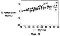 На ФИГ.5В представлено отсутствие эффекта соединения примера 11 при 1 мкмоль/кг TIW (6 доз) (●) и 2 мкмоль/кг TIW (6 доз) (▼) на массу мышей Balb/c относительно контролей без введения (■).FIG. 5B shows the absence of the effect of the compound of Example 11 at 1 μmol / kg TIW (6 doses) (●) and 2 μmol / kg TIW (6 doses) (▼) on the weight of Balb / c mice relative to controls without administration (■).