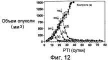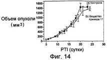 На ФИГ.14 представлено отсутствие активности соединения примера 11 (b) при введении 2 мкмоль/кг TIW в течение двух недель в отношении отрицательных по рецептору для фолата опухолей 4Т1 у мышей Ваblb/с по сравнению с контролями (а). Данные на ФИГ.14 показывают, что соединение примера 11 (b) не обладает никаким эффектом на опухоли по сравнению с контролями (а) вследствие отсутствия рецепторов для фолата на этих опухолях.FIG. 14 shows the lack of activity of the compound of Example 11 (b) when 2 μmol / kg TIW was administered for two weeks against 4T1 tumor negative receptor folate in Babb / c mice compared to controls (a). The data in FIG. 14 show that the compound of Example 11 (b) has no effect on tumors compared to controls (a) due to the lack of folate receptors on these tumors.