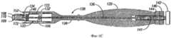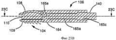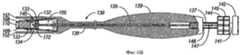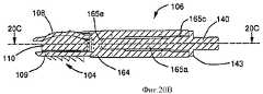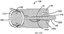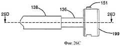 После ознакомления с настоящим раскрытием специалисты легко найдут множество альтернативных средств для соединения, сборки, прикрепления или сцепления иным способом устройства (100) и корпуса (130). Например, корпус (130) может быть снабжен приводом (136), таким как стержень, ствол, трос или другая передаточная или управляющая конструкция, например как проиллюстрировано на фиг.6А, 6В и 6С. Привод (136) в различных вариантах выполнения может иметь средства взаимодействия, например проиллюстрированный резьбовой конец (134) стержня (136), для взаимодействия или соединения с соединителем (140), например с проиллюстрированным на фиг.3 резьбовым отверстием приспособления (106). Стержень (136), установленный во взаимодействии, как указано выше, может удерживать и толкать приспособление (106) во время имплантации.After reading this disclosure, those skilled in the art will easily find many alternative means for connecting, assembling, attaching or otherwise coupling the device (100) and the housing (130). For example, the housing (130) may be provided with a drive (136), such as a rod, barrel, cable or other transmission or control structure, for example as illustrated in FIGS. 6A, 6B and 6C. The actuator (136) in various embodiments may have interaction means, for example, the illustrated threaded end (134) of the shaft (136), for interaction or connection with a connector (140), for example, with the threaded hole of the device (106) illustrated in FIG. The rod (136), mounted in cooperation, as described above, can hold and push the device (106) during implantation.