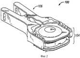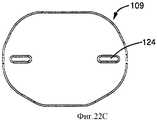 В различных вариантах выполнения пластины (108, 109) и сердечник (110) протеза (104) могут быть удерживаемы приспособлением (106) или соединены с ним с возможностью отсоединения. Приспособление (106) может быть выполнено различными способами, например в форме головки, держателя или другого носителя собранного протеза (104). При необходимости приспособление (106) может иметь зажимные губки (121), которые удерживают протез посредством захвата или зажима боковых краев верхней и нижней пластин протеза. Приспособление (106) также может содержать по меньшей мере один необязательный фиксатор, например собачку (120). Собачки (120) могут быть зацеплены за соответствующую выемку (122), расположенную в подвижном сердечнике (110), и входить в контакт с соответствующим стержнем (124), расположенным на пластине (109), или захватывать его. Собачки (120) могут иметь поверхности, по существу соответствующие зазору и/или конфигурации наружных поверхностей выемок (122). По меньшей мере одна собачка (120) может быть снабжена каналом, по существу соответствующим краю одного из соответственных стержней (124) для увеличения эффективности захвата на пластине (109). Кроме того, при необходимости приспособление (106) может содержать дополнительные фиксирующие, захватные или крепежные средства, например проиллюстрированные защелки (123), которые расположены на зажимных губках (121) и которые могут быть сцеплены с взаимодополняющими фиксирующими, захватными или крепежными средствами, например приемником, выемкой, насечкой и т.д., например выемками (111), расположенными вдоль противоположных боковых краев пластины (108). Например, на фиг.22А показан пример выемки (111), обеспечивающей удержание пластины (108) приспособлением (106, не показано на этом чертеже), например благодаря защелкам (123), а на фиг.22В показан пример стержня (124) (ствола, бруса, штыря или столбика) пластины (109), обеспечивающего удержание этой пластины и содержащего заплечик (12), предназначенный для взаимодействия с собачками (120) приспособления (106) для поддержки протеза и предотвращения выпадения протеза при его удержании приспособлением (106), например типа, подробно описанного ниже со ссылками на фиг.18 (А-С). При ознакомлении с настоящим описанием следует понимать, что могут быть предусмотрены различные варианты выполнения держателя и приспособления с дополнительным зажимом (126) для удержания протеза или без него.In various embodiments, the plates (108, 109) and the core (110) of the prosthesis (104) can be held by the device (106) or can be disconnected with it. The device (106) can be performed in various ways, for example, in the form of a head, holder or other carrier of an assembled prosthesis (104). If necessary, the device (106) may have clamping jaws (121) that hold the prosthesis by gripping or clamping the side edges of the upper and lower plates of the prosthesis. The device (106) may also contain at least one optional latch, for example a dog (120). Dogs (120) can be hooked to a corresponding recess (122) located in the movable core (110) and come into contact with or capture a corresponding rod (124) located on the plate (109). Dogs (120) may have surfaces substantially corresponding to the clearance and / or configuration of the outer surfaces of the recesses (122). At least one dog (120) may be provided with a channel essentially corresponding to the edge of one of the respective rods (124) to increase the capture efficiency on the plate (109). In addition, if necessary, the device (106) may include additional fixing, gripping or fixing means, for example illustrated latches (123), which are located on the clamping jaws (121) and which can be coupled with complementary fixing, gripping or fixing means, for example, a receiver a recess, a notch, etc., for example, recesses (111) located along opposite lateral edges of the plate (108). For example, FIG. 22A shows an example of a recess (111) for holding the plate (108) by a fixture (106, not shown), for example by means of latches (123), and FIG. 22B shows an example of a rod (124) (barrel) , a bar, a pin or a column) of a plate (109) that 