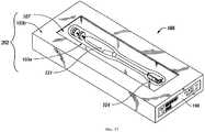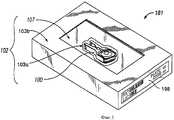 Как отмечено выше, в различных вариантах выполнения пакеты (102) устройств (100) предпочтительно содержат идентифицирующую информацию. Например, различные варианты выполнения при необходимости содержат упаковочную бирку (198, фиг.16) с идентифицирующей информацией (180). На бирке (180), расположенной на пакете (102), предпочтительно указаны размеры пластины упакованного протеза, высота сердечника и угол коррекции лордоза и/или кифоза при наличии такого угла, а также обозначение единицы складского учета пакета (102) и другая информация, которая упомянута выше и часть или вся из которой предпочтительно может быть закодирована в сканируемом коде, включенном в бирку, или в другом компоненте упаковки, например в интегральной микросхеме или приемоответчике. При необходимости может быть представлена и другая информация (180), например дополнительная информация для управления логистикой, например данные приемочного контроля, точки подачи заказа, время выполнения заказа и т.д., или информация, относящаяся к хирургическим технологиям и оборудованию. Кодирование может быть осуществлено с применением штрихкодов или других оптических кодов, магнитных полос, радиочастотной идентификации или другой известной технологии. Информация (180) на пакете (102) предпочтительно может быть считываемой при хранении устройства (100) в шкафу.As noted above, in various embodiments, packages (102) of devices (100) preferably comprise identifying information. For example, various embodiments, if necessary, comprise a packaging tag (198, FIG. 16) with identifying information (180). The tag (180) located on the package (102) preferably indicates the dimensions of the plate of the packed prosthesis, the height of the core and the angle of correction of lordosis and / or kyphosis if there is such an angle, as well as the designation of the unit of inventory accounting of the package (102) and other information that mentioned above and part or all of which can preferably be encoded in a scanned code included in the tag, or in another component of the package, for example in an integrated circuit or transponder. If necessary, other information can be provided (180), for example, additional information for logistics management, for example, acceptance control data, points of order submission, lead time, etc., or information related to surgical technologies and equipment. Coding can be carried out using barcodes or other optical codes, magnetic strips, radio frequency identification or other known technology. Information (180) on the bag (102) can preferably be read when the device (100) is stored in a cabinet.