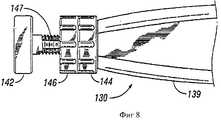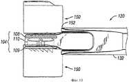 На фиг.7 проиллюстрировано начало этапа вставки варианта выполнения хирургической процедуры. Инструмент (130) и устройство (100) могут быть выполнены и отрегулированы, как описано выше. Инструмент (130) и устройство (100) могут быть расположены по требуемой оси вставки протеза с приведением краев (152) опоры (132) в контакт с соответствующими позвонками (150) для задания пространства межпозвоночного диска, принимающего протез (104). В различных вариантах выполнения хирург может прикладывать к ручке (142) силу путем нажатия на него или ударения по нему мягким молотком или рукой. Силу можно прикладывать до упора ограничителя (144) в конец рукоятки (139), как показано на фиг.8. Когда ограничитель (144) уперт в конец рукоятки (139), конец (134) стержня (136) вытолкнет приспособление (106) в положение, в котором протез (104) должным образом расположен в пространстве для межпозвоночного диска между позвонками (150). На фиг.9 и 10 приведена наглядная иллюстрация окончательного расположения на этом этапе.7 illustrates the beginning of the insertion step of an embodiment of a surgical procedure. The tool (130) and the device (100) can be made and adjusted as described above. Instrument (130) and device (100) can be located on the desired axis of insertion of the prosthesis with bringing the edges (152) of the support (132) into contact with the corresponding vertebrae (150) to define the space of the intervertebral disc receiving the prosthesis (104). In various embodiments, the surgeon may apply force to the handle (142) by pressing on it or striking it with a soft hammer or hand. The force can be applied all the way to the limiter (144) at the end of the handle (139), as shown in Fig. 8. When the stopper (144) rests on the end of the handle (139), the end (134) of the shaft (136) will push the device (106) into the position where the prosthesis (104) is properly located in the space for the intervertebral disc between the vertebrae (150). Figures 9 and 10 provide a visual illustration of the final location at this stage.