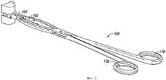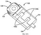 В различных вариантах выполнения приспособление (106) может иметь приводящие средства для высвобождения протеза (104). В различных вариантах выполнения привод может быть выполнен в виде подпружиненных рычагов, хвостовиков, стержней или других приводящих средств (164), выполненных с возможностью поворота вокруг поворотных средств, например шарнирного пальца (172). В другом случае приспособление (106) может содержать встроенную шарнирную часть, вокруг которой обеспечена возможность поворота рычагов, хвостовиков, стержней или других приводящих средств (164) и которая, например, содержит гибкий материал, такой как пластик или резина, или имеет признаки, обеспечивающие уменьшение напряжения и/или деформации, например вырезы или пустоты.In various embodiments, the device (106) may have a drive means for releasing the prosthesis (104). In various embodiments, the actuator can be made in the form of spring-loaded levers, shanks, rods, or other driving means (164), configured to rotate around rotary means, for example, a pivot pin (172). In another case, the device (106) may include an integrated hinge part around which it is possible to turn levers, shanks, rods or other driving means (164) and which, for example, contains flexible material, such as plastic or rubber, or has signs that provide reduction of stress and / or deformation, for example cutouts or voids.