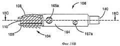 На фиг.18А показан вариант выполнения приспособления (106), удерживающего протез (104) в частности благодаря взаимодействию между защелками (123) приспособления и выемками (111) пластины (108) протеза (104), формирующими механизм для фиксирования протеза (104) на приспособлении (106). В этом примере, показанном на фиг.18 (А-С), две части (164) корпуса приспособления (106) имеют по существу форму параллелепипеда, за исключением конца, снабженного собачками и защелками для удержания протеза. Таким образом, две части (164) корпуса, разделенного вдоль своей продольной оси, собраны вокруг протеза и взаимодействуют в этом примере через по существу плоскую поверхность. Две части (164) корпуса приспособления (106) снабжены соединителем (140), обеспечивающим установку приспособления (106) на инструменте (131, например, фиг.25А и 25В). Следует отметить, что могут быть предусмотрены несколько вариантов выполнения приспособления, содержащего только один соединитель только на одной из двух частей своего корпуса. В показанном примере этот соединитель (140) содержит стержень, предназначенный для взаимодействия с приводом (136, фиг.25В), например стержень, снабженный резьбовым отверстием (134) для его навинчивания на соединитель (140). Следует отметить, что конструкция, содержащая стержень (резьбовой стержень) соединителя (140) и отверстие (134, фиг.26В) привода (136) инструмента (131), разумеется, может быть взаимообратной или может быть заменена другими средствами соединения, удержания, фиксирования приспособления (106) и инструмента (131). Таким образом, например, соединитель приспособления может содержать резьбовое отверстие (140), взаимодействующее с резьбовым концом (134) привода (136) вставочного инструмента. В других вариантах выполнения соединитель (140) может содержать стержень, имеющий срез (165d), предназначенный для взаимодействия с проходом, содержащим заплечик, на конце привода (136, фиг.25В). В других вариантах выполнения соединитель (140) может содержать стержень, имеющий резьбу и срез (165d), так что приспособлением (106) и/или штифтом (165а), в случае если он удерживает соединитель (140), как подробно описано ниже, можно манипулировать как с помощью инструмента, содержащего заплечик, взаимодействующий со срезом, так и с помощью инструмента, содержащего резьбовое отверстие. Кроме того, другие предусмотренные варианты выполнения содержат соединитель, имеющий резьбовое отверстие, в нижней части которого расположен заплечик, причем таким образом этот соединитель может взаимодействовать как с резьбовым концом (134) привода (136, фиг.25В), так и с инструментом, содержащим стержень со срезом на конце. На фиг.18В представлено сечение такого варианта выполнения с изогнутыми под углом краями (115) пластин (108, 109) протеза, упираемыми в изогнутые под углом поверхности или края приспособления (106). В некоторых вариантах выполнения (не показаны) приспособление (106) также содержит заплечик или поверхность для контакта с сердечником (110) для поддержания различных компонентов (108, 109, 110) протеза в положении, подходящем для их вставки между позвонками. Как, в частности, видно на фиг.18С, сборка двух частей (164) корпуса приспособления (106) выполнена в этом примере с помощью по меньшей мере одного штифта (165а), проходящего в поперечном направлении через приспособление (106), от одного бока до другого, в горизонтальной плоскости. В этом прим