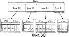На фиг. 3С показано, что каждая из двух зон разделена на две субзоны, так что в общей сложности скомпонованы 4 субзоны. Иными словами, две зоны попеременно повторяются в таком порядке, как (0,0), субзона (1,0), субзона (0,1) и субзона (1,1), и отображены в кадре, как показано на фиг. 3С. Кроме того, размер соответствующей зоны определяется путем сложения двух субзон, принадлежащих каждой зоне.In FIG. 3C shows that each of the two zones is divided into two subzones, so that a total of 4 subzones are arranged. In other words, the two zones are alternately repeated in the order of (0,0), subzone (1,0), subzone (0,1) and subzone (1,1), and are displayed in the frame as shown in FIG. 3C. In addition, the size of the corresponding zone is determined by adding up two subzones belonging to each zone.