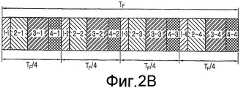 Обращаясь к фиг. 2В отмечаем, что 4 субдоли, составляющие одну услугу, должны отстоять друг от друга как можно дальше, чтобы достичь временного разнесения. Поскольку каждая из услуг конфигурирована с одним и тем же числом субдолей, расстояние между субдолями, принадлежащими одной и той же услуге, является постоянным. То есть, поскольку услуга разделена на 4 субдоли, интервал или расстояние между субдолями, принадлежащими одной и той же услуге, оказывается равным величине, полученной путем деления всего суммарного периода TF кадра на 4, вследствие чего субдоли имеют неизменный интервал. Например, на фиг. 2В показан интервал TF/4 между 4-мя субдолями 1-1, 1-2, 1-3 и 1-4 (где первые цифры представляют собой индексы услуги, а последние цифры представляют собой индексы субдолей), принадлежащими первой услуге. Поскольку расстояние между субдолями, принадлежащими одной и той же услуге, одинаково, порядок субдолей для каждой услуги, скомпонованных в первом периоде TF/4, одинаковым образом повторяется каждый период TF/4.Turning to FIG. 2B, we note that the 4 sub-shares that make up one service should be separated from each other as far as possible in order to achieve temporary diversity. Since each of the services is configured with the same number of sub-shares, the distance between the sub-shares belonging to the same service is constant. That is, since the service is divided into 4 sub-shares, the interval or distance between sub-shares belonging to the same service is equal to the value obtained by dividing the total total period TF of the frame by 4, so that the sub-shares have an unchanged interval. For example, in FIG. 2B shows the interval TF / 4 between 4 sub-shares 1-1, 1-2, 1-3, and 1-4 (where the first digits are service indices and the last digits are sub-indices) belonging to the first service. Since the distance between sub-shares belonging to the same service is the same, the order of sub-shares for each service arranged in the first period TF / 4 is repeated in the same way each period TF / 4.