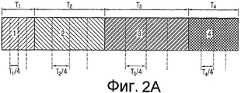 Обращаясь к фиг. 2А, отмечаем, что здесь можно увидеть обычную структуру кадра, в которой размещены логические услуги. Когда их индексы услуг заданы как 1, 2, 3 и 4, в кадре можно скомпоновать в произвольном порядке 4 услуги. В примере, показанном на фиг. 2А, услуги скомпонованы в убывающем порядке значения индекса. Кроме того, периоды услуг соответственно обозначены символами T1, T2, T3 и T4.Turning to FIG. 2A, we note that here you can see the usual frame structure in which the logical services are located. When their service indices are set to 1, 2, 3, and 4, 4 services can be arranged in a random order in a frame. In the example shown in FIG. 2A, services are arranged in descending order of index value. In addition, service periods are respectively indicated by the symbols T1, T2, T3 and T4.