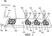 [0032] Фиг.5 представляет собой компоновочную схему пассивного ПАВ-устройства с беспроводным опросом, выполненного в соответствии с одним из вариантов осуществления настоящего изобретения.[0032] Fig. 5 is a schematic diagram of a passive wireless interrogation SAW device in accordance with one embodiment of the present invention.