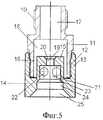 Центробежная вихревая форсунка (фиг.5) включает в свой состав корпус 10, который выполнен в виде подводящего штуцера с отверстием 17 для подвода жидкости из магистрали, и соосно соединенной с ним цилиндрической гильзой 11 с внешней резьбой 12. Соосно корпусу 10, в его нижней части подсоединено посредством гильзы 13 с внутренней резьбой сопло 14, выполненное в виде центробежного завихрителя 15 потока жидкости в виде глухой цилиндрической вставки 21 с.по крайней мере тремя, тангенциальными вводами 22 в виде цилиндрических отверстий. Гильза 13 является частью сопла 14 и установлена коаксиально и соосно по отношению к центробежному завихрителю 15.The centrifugal vortex nozzle (Fig. 5) includes a