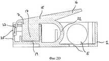 На свободном конце первой ножки 15 имеется первое стопорное средство 23, которое продолжается, по существу, под прямым углом к нижней пластине кассеты 1. Тавровый профиль продолжается, по существу, от нижнего конца первого стопорного средства 23 до дальнего конца удерживающего рычага 16. Первое стопорное средство 23 содержит выступ, выступающий, в общем, в сторону от изгибающегося участка 21. Ответным элементом первого стопорного средства 23 является второе стопорное средство 25, расположенное на свободном конце второй ножки 19. В предпочтительном варианте осуществления настоящего изобретения второе стопорное средство 25 имеет горизонтальную прорезь, длина которой обеспечивает зацепление крючкообразного первого стопорного средства 23 и прорези второго стопорного средства 25 в закрытом положении зажимного элемента 7 (показано на фиг.2D). Таким образом, второе стопорное средство 25 в этом варианте осуществления изобретения имеет большую ширину, чем первое стопорное средство 23, как можно видеть на фиг.2А. В предпочтительном варианте осуществления изобретения в открытом положении зажимного элемента 7 зацепление между первым и вторым стопорными средствами (показано на фиг.2Е) отсутствует. Следует отметить, что для обеспечения стопорной функции зажимного элемента 7 в первом и втором стопорном средствах 23, 25 могут быть использованы любые другие элементы зацепления.At the free end of the