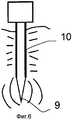 Для воздействия на различные локализации патологий мягких тканей и органов используют сапфировые хладопроводы с соответствующей геометрией и обработкой сапфировой поверхности, а также с нанесенными покрытиями. Так, для замораживания патологии, находящейся в глубине ткани, используется сапфировый хладопровод с конусным торцем 9, с помощью которого он самостоятельно позиционируется в ткани (Фиг.6). Поверхность цилиндрической части с поглощающим покрытием 10 нагревается от пропускаемого лазерного излучения и предотвращает криоповреждение здоровых тканей, через которые проходит хладопровод. Незначительное количество излучения, достигающее при этом конической части острия, преимущественно концентрируется в его окончании. Вызванное им повышение температуры в ткани незначительно и не влияет на образование ледяного шара в процессе криовоздействия.To influence various localizations of pathologies of soft tissues and organs, sapphire cold pipes with the appropriate geometry and processing of the sapphire surface, as well as with applied coatings, are used. So, to freeze a pathology located deep in the tissue, a sapphire cold conduit with a