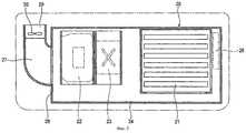 Коробка 20 электрических частей является корпусом 24 для размещения"элементов, имеющим, по существу, прямоугольную форму коробки в виде параллелепипеда, которая имеет открытую сторону, при этом модуль 21 аккумуляторной батареи, модуль 22 обратного преобразователя, и модуль 23 преобразователя постоянного тока в постоянный (DC-DC) размещаются в корпусе 24 для размещения элементов. Коробка 20 электрических частей располагается за главной частью 5 спинки заднего сиденья 7 в состоянии, когда крышка 25 привинчивается к корпусу 24 для размещения элементов, чтобы закрыть его открытую сторону.The