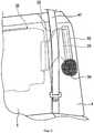Участок 35 отверстия располагается в поперечном направлении наружу по отношению к промежуточному в поперечном направлении положению боковой части 4 спинки сиденья, таким образом он не может быть закрыт рукой или плечом пассажира 45, или непристегнутым ремнем 47 безопасности. Таким образом, воздух может надежно забираться из пассажирского отделения 9, чтобы затем подаваться в коробку 20 электрических частей как охлаждающий воздух, для того чтобы охлаждать модуль 21 аккумуляторной батареи, модуль 22 обратного преобразователя, и модуль 23 преобразователя постоянного тока в постоянный (DC-DC).The