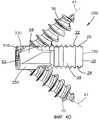 Во время операции имплантат 200 размещают между телами V соседних позвонков, а элементы 70 фиксации костей продвигают в отверстия 40 для фиксации костей до тех пор, пока самый проксимальный виток резьбы 73, выполненный на стержне 72 элемента 70 фиксации костей, не пройдет мимо выступающего механизма 350 блокировки резьбы. В этом положении элементы 70 фиксации резьбы полностью устанавливаются относительно пластины 250. Дистальная поверхность механизма блокировки резьбы 350 контактирует с проксимальной стороной самого проксимального витка резьбы 73, выполненного на стержнях 72 элементов 70 фиксации костей, ограничивая вывинчивание элементов 70 фиксации костей из отверстий 40 для фиксации костей. Элементы 70 фиксации костей в общем случае свободно вращаются после полной установки благодаря наличию поднутрений 75 между самым проксимальным витком 73 резьбы и дистальным участком головки 74 каждого элемента 70 фиксации костей, что дает возможность отставания перемещения тел V позвонков относительно имплантата 200 в процессе имплантации. Вертушка 310 может быть использована вместе с механизмом 350 блокировки резьбы для закрепления положения имплантата 200 во время вставки элементов 270 фиксации костей, а также для дополнительного предохранения от вывинчивания. В качестве альтернативы предусмотрено, что механизм блокировки резьбы 350 может быть встроен в имплантат 10 согласно первому предпочтительному варианту осуществления.During surgery, the