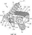 На Фиг. 4А-5B показано, что межпозвонковый имплантат 200 согласно второму предпочтительному варианту осуществления включает в себя вставку 220, пластину 250, первый и второй элементы 70 фиксации костей и удерживающий механизм. Согласно второму предпочтительному варианту осуществления удерживающий механизм представляет собой подвижную вертушку 310, которая перемещается, а более предпочтительно - поворачивается между первым положением (проиллюстрировано на Фиг. 4А, 4B и 5А) и вторым положением (проиллюстрировано на Фиг. 4С, 4D и 5В). В первом положении вертушка 310 не взаимодействует с первым и вторым отверстиями 40 для фиксации костей, так что первый и второй элемент 70 фиксации костей можно вставить в тела V соседних позвонков. Во втором положении вертушка 310 блокирует или закрывает, по меньшей мере, участки отверстий 40 для фиксации костей и, следовательно, по меньшей мере, участки имплантированных элементов 70 фиксации костей, препятствуя вывинчиванию.In FIG. 4A-5B show that an