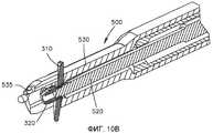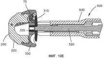 На Фиг. 10А-10Е представлен пример инструмента 500 для вставки и способа вставки имплантата 200, которые будут описаны далее. В связи с примером способа вертушка 310 будет описана и проиллюстирована открепленной от пластины 250. Однако данный иллюстративный способ может быть легко адаптирован к работе с вертушкой 310, предварительно прикрепленной к пластине 250, или с первым предпочтительным вариантом осуществления имплантата 10, что станет очевидным специалисту в данной области техники, имеющему среднюю квалификацию, после изучения данной заявки.In FIG. 10A-10E show an example of an