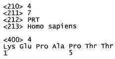 [0048] Нуклеиновокислотная и аминокислотная последовательности нескольких нативных и рекомбинантных белков PRG4 или любрицина, а также характеристика белков PRG4 и его различных изоформ раскрыты, например, в патентах США №№5326558, 6433142, 7030223, 7361738 Turner et al. и в патентах США №№6743774 и 6960562 Jay et al. Публикация США №20070191268 Flannery et al. также раскрывает молекулы рекомбинантного PRG4 или любрицина, упоминаемые в данном изобретении.[0048] The nucleic acid and amino acid sequences of several native and recombinant PRG4 or lubricin proteins, as well as the characterization of PRG4 proteins and its various isoforms are disclosed, for example, in US Pat. Nos. 5326558, 6433142, 7030223, 7361738 Turner et al. and U.S. Patent Nos. 6,743,774 and 6,960,562 to Jay et al. U.S. Publication No. 20070191268 Flannery et al. also discloses recombinant PRG4 or lubricin molecules referred to in this invention.