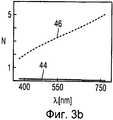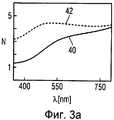Эти разные свойства иллюстрирует фиг.3; здесь на каждом графике показана кривая действительной части n и мнимой части k комплексного показателя преломления N как функция длины волны: на фиг.3(а) - для хрома, на фиг.3(b) - для серебра. Как видно из фиг.3(а), в случае хрома значения n (непрерывная кривая 40) и k (пунктирная кривая 42) во всем видимом диапазоне спектра имеют один и тот же порядок и нигде не отличаются больше, чем приблизительно в 2,5 раза. Напротив, в случае серебра, как показывают соответствующие кривые для n и k, как видно на фиг.3(b), мнимая часть k - пунктирная кривая 46 - в видимой области спектра приблизительно в 10-30 раз больше действительной части n (непрерывная кривая 44).These various properties are illustrated in FIG. 3; here, on each graph, a curve is shown of the real part n and imaginary part k of the complex refractive index N as a function of wavelength: in Fig. 3 (a) for chromium, in Fig. 3 (b) for silver. As can be seen from figure 3 (a), in the case of chromium, the values of n (continuous curve 40) and k (dashed curve 42) in the entire visible range of the spectrum are of the same order and do not differ anywhere more than approximately 2.5 times. On the contrary, in the case of silver, as shown by the corresponding curves for n and k, as can be seen in Fig. 3 (b), the imaginary part k - dashed curve 46 - in the visible region of the spectrum is approximately 10-30 times larger than the real part n (continuous curve 44).