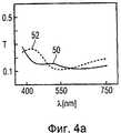 На фиг.4(а) показано пропускание обычной симметричной структуры хром/диэлектрик/хром при наблюдении под прямым углом (непрерывная кривая 50) и под наклоном (пунктирная кривая 52). Толщина слоев в этой структуре предпочтительно составляет 300 нм для слоя диэлектрика и 8 нм для слоев хрома. В обоих случаях спектры пропускания практически плоские, так что пропускаемый свет насыщенности цвета почти не имеет и поэтому выглядит сероватым. Соответственно просвечивающие защитные элементы на основе тонкопленочного элемента хром/диэлектрик/хром в оптическом отношении мало заметны.Figure 4 (a) shows the transmission of the usual symmetrical structure of chromium / dielectric / chromium when observed at right angles (continuous curve 50) and at an angle (dashed curve 52). The layer thickness in this structure is preferably 300 nm for the dielectric layer and 8 nm for the chromium layers. In both cases, the transmission spectra are almost flat, so the transmitted light has almost no color saturation and therefore looks grayish. Correspondingly, translucent protective elements based on a thin-film chromium / dielectric / chromium element are hardly noticeable in optical terms.