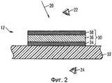 Чтобы создать названные цветовые эффекты просвечивающий защитный элемент 12, показанный на фиг.2, имеет прозрачную полимерную пленку 32, на которую нанесен трехслойный симметричный тонкопленочный элемент 30 с интерференционной слоистой структурой в виде требуемого мотива 16. Тонкопленочный элемент 30 состоит из первого полупрозрачного поглощающего слоя 34, который в данном примере осуществления изобретения образован слоем серебра толщиной 25 нм, диэлектрического разделительного слоя 36, который в данном примере образован слоем SiO2 толщиной 270 нм, и второго полупрозрачного поглощающего слоя 38, который в этом примере образован еще одним слоем серебра толщиной 25 нм.In order to create the above color effects, the translucent