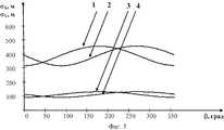 На фиг.5 приведены среднеквадратические ошибки определения координат X и Y, полученные при условиях R0=450 км, а=b=100 км σR=100 м, и V=200 м/с, где кривые 1 и 2 соответствует значению σX и σY для существующего способа, а кривые 3 и 4 - значению σX и σY для предлагаемого способа определения координат.Figure 5 shows the root mean square errors of determining the coordinates X and Y obtained under the conditions R0 = 450 km, a = b = 100 km, σR = 100 m, and V = 200 m / s, where