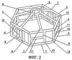 Выполнение нижнего и верхнего основания каркаса в форме подобных многоугольников позволяет присоединить наклонные балки, образующие свод крыши, противоположными концами к центрам баллонов, расположенных в горизонтальной плоскости нижнего и верхнего концов балок, что повышает технологичность конструкции и позволяет осуществить надежное клеевое соединение.The implementation of the lower and upper base of the frame in the form of such polygons allows you to attach the inclined beams forming the roof arch with opposite ends to the centers of the cylinders located in the horizontal plane of the lower and upper ends of the beams, which increases the manufacturability of the structure and allows for reliable adhesive bonding.