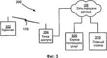 Вместе эти усовершенствования делают целесообразным, среди других применений, использование точек доступа низкой стоимости, отвечающих стандарту IEEE 802.11, соединенных с абонентскими Интернет-соединениями для обеспечения масштабной широкополосной сети мобильной связи. На фиг.3 показана третья система 300 связи. Система 300 связи содержит терминал 102, точку 104 доступа, сервер 106 поставщика услуг, сеть 108 для передачи данных и так называемый главный сервер 310. Как указано выше, терминал 102 может быть компьютером, карманным персональным компьютером, устройством мобильной связи или аналогичным устройством. Терминал может отвечать стандарту IEEE 802.11. Настоящее изобретение не требует изменения терминала, совместимого со стандартом IEEE 802.11. Точка 104 доступа выполнена с возможностью оперативного соединения как с сервером 106 поставщика услуг, так и с главным сервером 310 через сеть 108 для передачи данных.Together, these improvements make it advisable, among other applications, to use low cost access points that comply with the IEEE 802.11 standard, connected to subscriber Internet connections to provide a large-scale broadband mobile communication network. 3, a