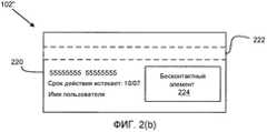 Фиг. 2(b) иллюстрирует пример портативного бытового устройства 102" в форме платежной карты в пластиковой подложке. Бесконтактный элемент 224 для взаимодействия с устройством 104 доступа может присутствовать или быть встроен в пластиковую подложку для 102". Потребительская информация 220, такая как номер счета, дата истечения срока действия и имя потребителя, может быть напечатана или нанесена тиснением на карту. Кроме того, магнитная полоса 222 также может располагаться на пластиковой подложке платежной карты 102".FIG. 2 (b) illustrates an example of a portable
