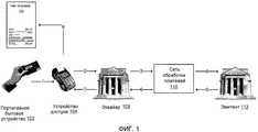Платежная транзакция инициируется, когда потребитель использует портативное бытовое устройство 102 в устройстве 104 доступа, которое находится у продавца. Эквайер 108, который является финансовым учреждением, ассоциированным с продавцом, может принимать информацию транзакции из устройства 104 доступа у продавца. Эквайер 108 перенаправляет информацию транзакции в сеть 110 обработки платежей, которая затем перенаправляет информацию транзакции в эмитент 112 для подтверждения транзакции. Эмитент 112 является финансовым учреждением, ассоциированным с портативным бытовым устройством 102. Подтверждение (или отказ) по транзакции в конечном счете отправляется обратно в устройство 104 доступа для завершения транзакции.A payment transaction is triggered when the consumer uses the