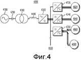 На фиг.4 показана блок-схема примерного варианта осуществления системы 4000, которая может содержать источник АС мощности, электросеть, сеть энергоснабжения и/или линию и т.д. 4100, такую как источник АС мощности шахты. Поступающее напряжение АС питания может вводиться через главный контактор 4200 в силовой трансформатор 4300 двигателя. Вторичное напряжение (например, 900 вольт переменного тока) от силового трансформатора 4300 двигателя может водиться через реактивный элемент 4400 в любое число AFE 4500. AFE 4500 могут преобразовывать АС напряжение в 1800 вольт постоянного тока и подавать его в DC шину или линию 4600 (которая может содержать любое желаемое число конденсаторов). DC линия 4600 может обеспечить постоянное DC питание для любого числа инверторов 4720, 4740, 4760, которые могут преобразовывать постоянное DC напряжение в напряжение переменного тока переменной частоты (например, (0-1400V3AC) для любого числа двигателей 4820 подъема, тяговых двигателей 4840, двигателей 4860 поворота и/или двигателей 4880 продвижения (или хода) и т.д. Эта модульная конструкция может быть запараллелена, чтобы возбуждать машины с различными требованиями по мощности. Та же самая базовая структура и электроника питания может использоваться, чтобы управлять традиционными асинхронными двигателями для редукторных применений, а также синхронными двигателями для безредукторных применений.Figure 4 shows a block diagram of an exemplary embodiment of a