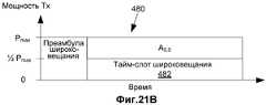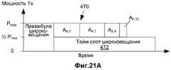 На Фиг. 21А показан фундаментальный тайм-слот 470 нисходящей линии связи с множеством субслотов согласно примерному варианту осуществления изобретения. Как показано на Фиг. 21А, субслоты разных размеров могут быть объединены для образования тайм-слота канала данных. Множество субслотов включает в себя субслот А4,0, субслот А4,1, субслот А5,4 и субслот А6,10. В качестве альтернативы можно использовать другие комбинации субслотов. Тайм-слот 472 широковещательного канала фундаментального тайм-слота 470 нисходящей линии связи может иметь коэффициент расширения 2048. В качестве альтернативы можно использовать другие значения. Тег или другое приемное устройство может включить свой приемник для прослушивания одного или нескольких из указанных субслотов, когда это потребуется. На Фиг. 21В показан фундаментальный тайм-слот 480 нисходящей линии связи с единым тайм-слотом А0,0 согласно примерному варианту осуществления изобретения. Тайм-слот 482 широковещательного канала фундаментального тайм-слота 480 нисходящей линии связи может иметь коэффициент расширения, равный 8192. В качестве альтернативы могут быть использованы другие значения.In FIG. 21A shows a fundamental downlink multiple