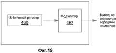 На Фиг. 19 представлена схема, иллюстрирующая обработку кадра преамбулы согласно примерному варианту осуществления изобретения. 16-битовый регистр 460 может обеспечить модулятор 462 символами для модуляции. В альтернативном варианте осуществления можно использовать регистр любой другой длины. Модулятор 462 может выводить модулированные символы с некоторой скоростью передачи символов. Модулятором 462 может быть модулятор, построенный по схеме дифференциальной двоичной фазовой манипуляции (DBPSK) либо модулятор любого другого типа, известного специалистам в данной области техники. В результате каждый символ преамбулы 452 широковещания может быть модулирован, расширен с максимальным коэффициентом расширения для нисходящей линии связи и усилен для передачи. В примерном варианте осуществления преамбула 452 широковещания может быть усилена путем обеспечения того, чтобы во время передачи преамбулы 452 широковещания не передавались никакие другие данные. Например, широковещательная передача преамбулы 452 может выполняться с мощностью Pmax через тайм-слот 454 широковещательного канала, а тайм-слот 456 канала данных может быть отключен на время широковещательной передачи преамбулы 452. В одном варианте осуществления преамбула 452 широковещания может передаваться в одном из каналов: I или Q. Преамбула 452 широковещания может быть умножена на масштабный коэффициент 1, так чтобы передача преамбулы 452 широковещания осуществлялась с полной мощностью. При отсутствии передачи преамбулы 452 широковещания можно использовать ослабляющий масштабный коэффициент, с тем чтобы данные передавались с мощностью, меньшей, чем полная мощность. В одном варианте осуществления ослабляющий масштабный коэффициент может быть равен 1/√2, что дает ослабление 3 дБ. В альтернативном варианте осуществления масштабный коэффициент может не изменяться. В указанном варианте осуществления преамбула 452 широковещания может передаваться как по I каналу, так и по Q каналу, так что преамбула 452 передается с полной мощностью.In FIG. 19 is a diagram illustrating preamble frame processing according to an exemplary embodiment of the invention. A 16-bit register 460 may provide a