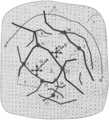 Нефтяную залежь 1 с трещиноватыми коллекторами разбуривают вертикальными скважинами 2-4 по сетке 600×600 м. Уточняют геологическое строение залежи 1, структурный план продуктивного пласта. По результатам сейсмических исследований методом 3D определяют, что преобладающее направление трещиноватости на залежи северо-западное. На карту эффективных нефтенасыщенных толщин продуктивного пласта наносят линии разуплотнений 5. Выделяют участки залежи 6, 7, ограниченные линиями 5 и узлами 8 разуплотнений.