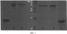 Для выделения белков, экспрессированных в указанных штаммах-продуцентах, использовали ферментативную обработку клеточных стенок бактерий лизоцимом, а также обработку клеток ультразвуком. Лизоцимом обрабатывали бактериальные клетки в течение 30 минут при +4°C, а ультразвуком воздействовали 3-4 раза (по 40 секунд) при мощности 80-100 Вт и одновременном охлаждении на ледяной бане. Полученный раствор центрифугировали 10 мин при 20000 g при температуре +4°C.To isolate the proteins expressed in these producer strains, we used the enzymatic treatment of the bacterial cell walls with lysozyme, as well as the ultrasound treatment of the cells. Bacterial cells were treated with lysozyme for 30 minutes at + 4 ° C, and sonicated 3-4 times (40 seconds) at a power of 80-100 W while cooling in an ice bath. The resulting solution was centrifuged for 10 min at 20,000 g at a temperature of + 4 ° C.